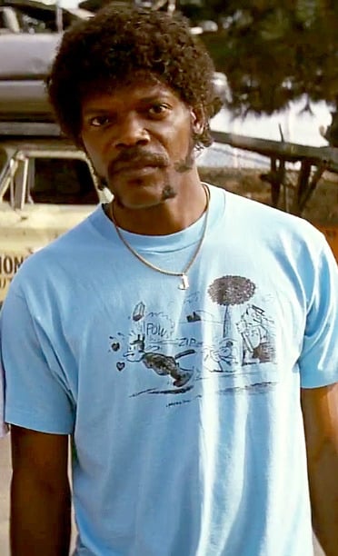 You too can try real hard to be the shepherd with this rare replica Pulp Fiction T-Shirt. This is the shirt that Samuel L. Jackson wears throughout the movie. Jackson's character Jules is given the T-Shirt to wear by Quentin Tarantino after the iconic car cleaning scene.